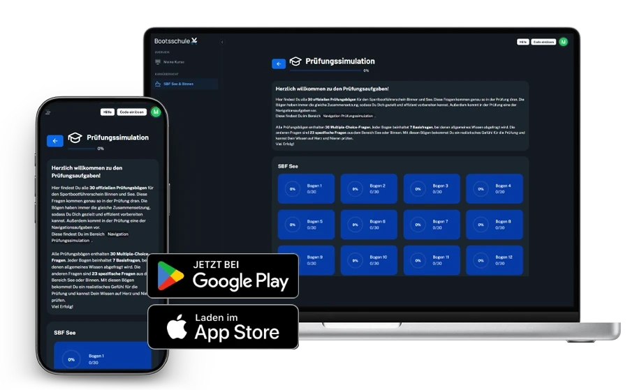 Im Preis ist alles enthalten, was Du für den Theorieteil Deines Sportbootführerscheins See & Binnen benötigst. Darunter eine moderne Lernplattform, ein Fragentrainer, Prüfungssimulationen mit echten Prüfungsfragen, ein Knotentrainer und das Willkommenspaket. Außerdem kannst Du Dich bei uns immer auf persönlichen Support verlassen. Plus: Bei uns gibt es eine Bestehensgarantie!