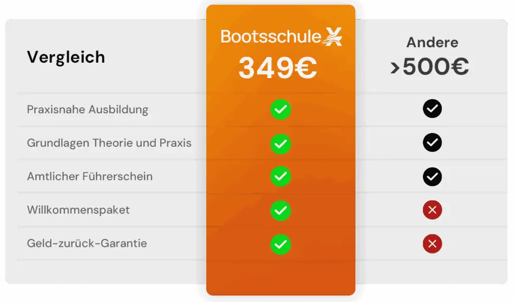 Im Unterschied zu vielen anderen Bootsschulen, die nur starten, wenn sich genügend Teilnehmer finden, suchen wir dir immer genau den Ausbilder, der zeitnah zu deinem Lernfortschritt passt. Wir prüfen sorgfältig, dass unsere Praxispartner erfahrene Profis sind, damit du bestmöglich vorbereitet in die Prüfung gehst. Und zwar ohne unnötige Verzögerungen, denn das steigert unsere Bestehensquote!