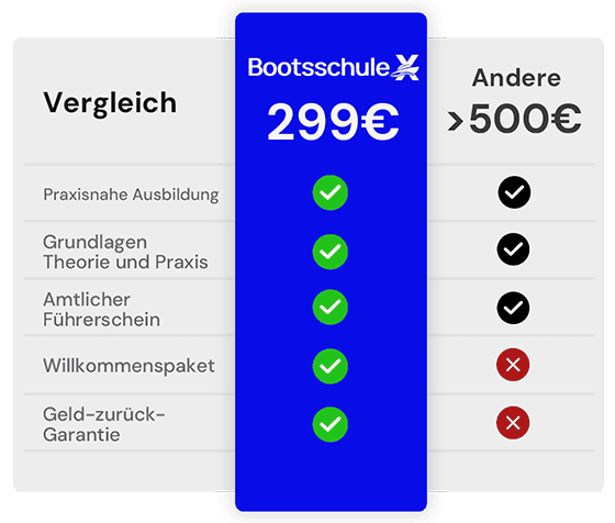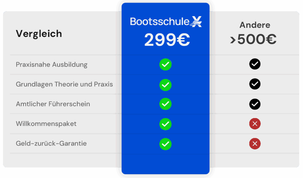 Im Unterschied zu vielen anderen Bootsschulen, die nur starten, wenn sich genügend Teilnehmer finden, suchen wir dir immer genau den Ausbilder, der zeitnah zu deinem Lernfortschritt passt. Wir prüfen sorgfältig, dass unsere Praxispartner erfahrene Profis sind, damit du bestmöglich vorbereitet in die Prüfung gehst. Und zwar ohne unnötige Verzögerungen, denn das steigert unsere Bestehensquote!