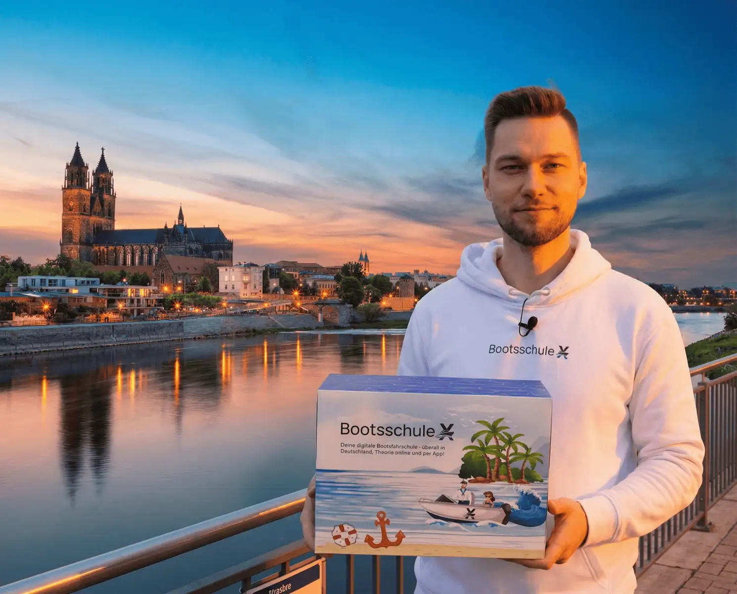 Die Theorie für den Bootsführerschein in Magdeburg absolvierst du online. Die Praxis sowie die praktische Prüfung finden vor Ort auf dem Wasser statt, da diese gesetzlich vorgeschrieben sind.